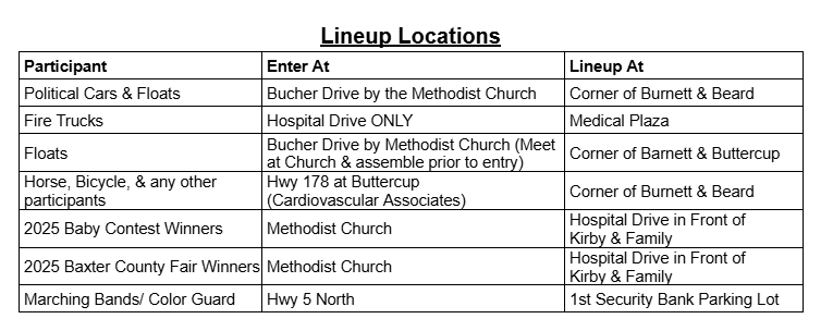 The Baxter County Fair Parade will be held on Saturday, September 6th at 10:00 AM. The parade will start at Long Chiropractic, 506 Hospital Drive, and will be led by the Baxter County Fair Queen. All entries must be in line for judging at 9:45 AM. No registration is required to enter the parade.